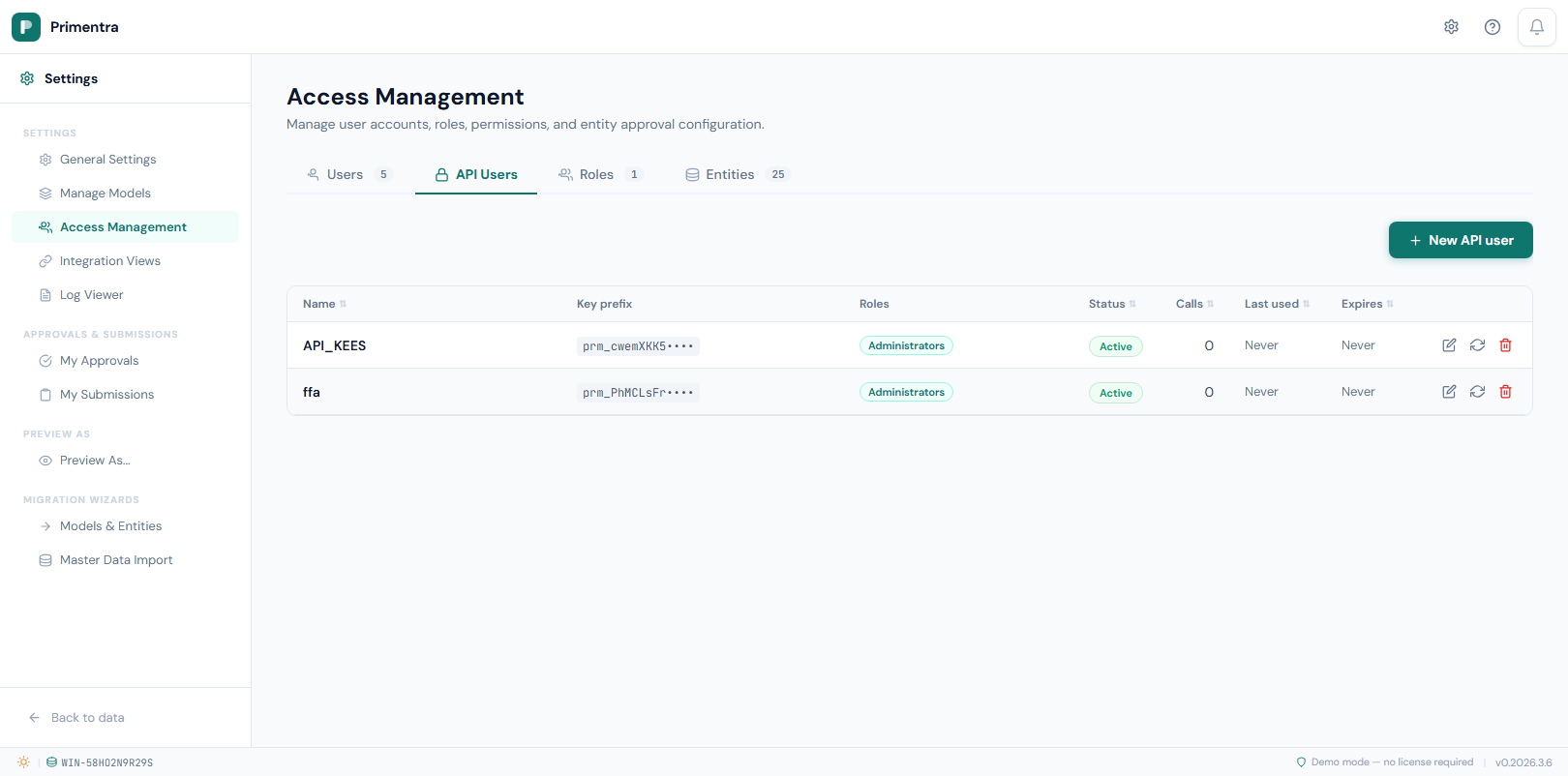 Edit an API user: Click any row to open the edit form. You can change the display name, role assignments, active status, or expiry date. The key is not affected.