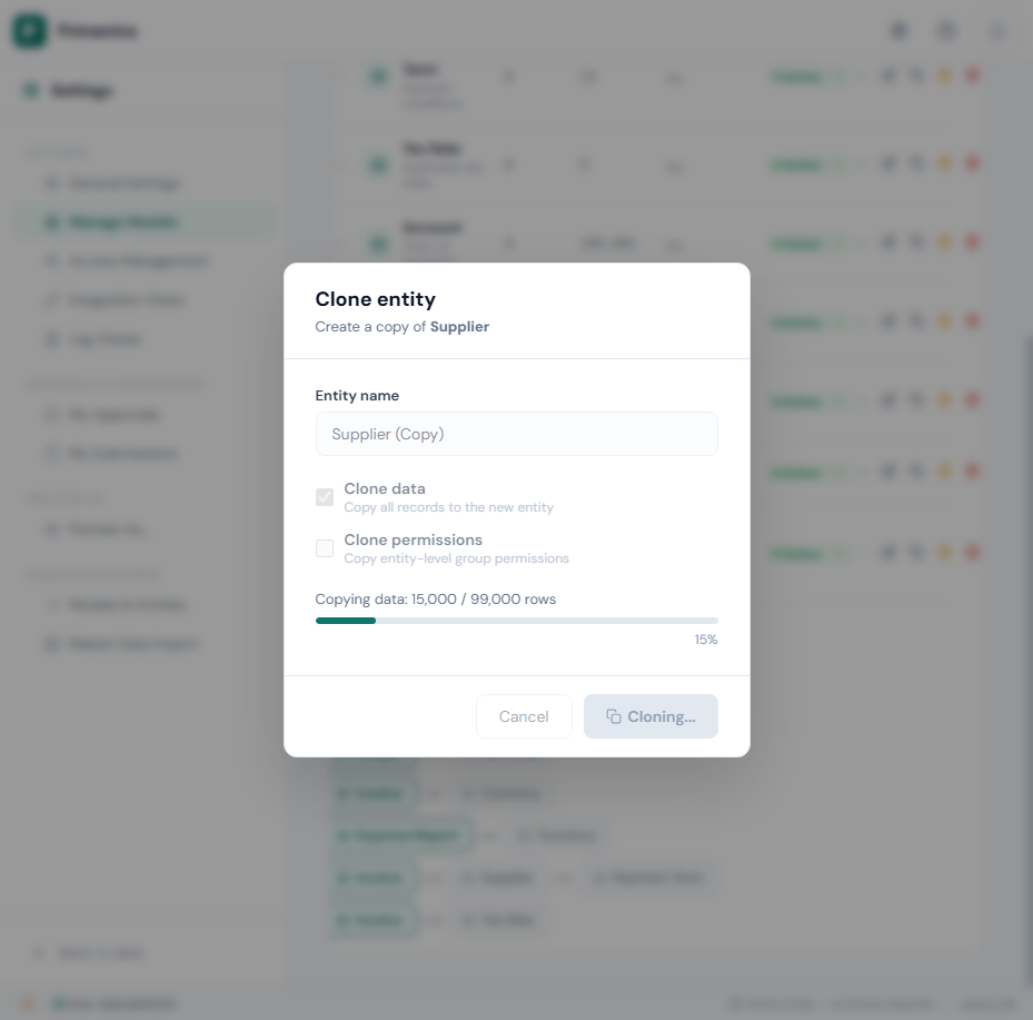 Real-time progress tracking — For large entities, a progress bar shows the exact number of rows copied (e.g. "Copying data: 15,000 / 99,000 rows") with a percentage indicator. Data is copied in batches so the operation never times out, even for entities with millions of rows.