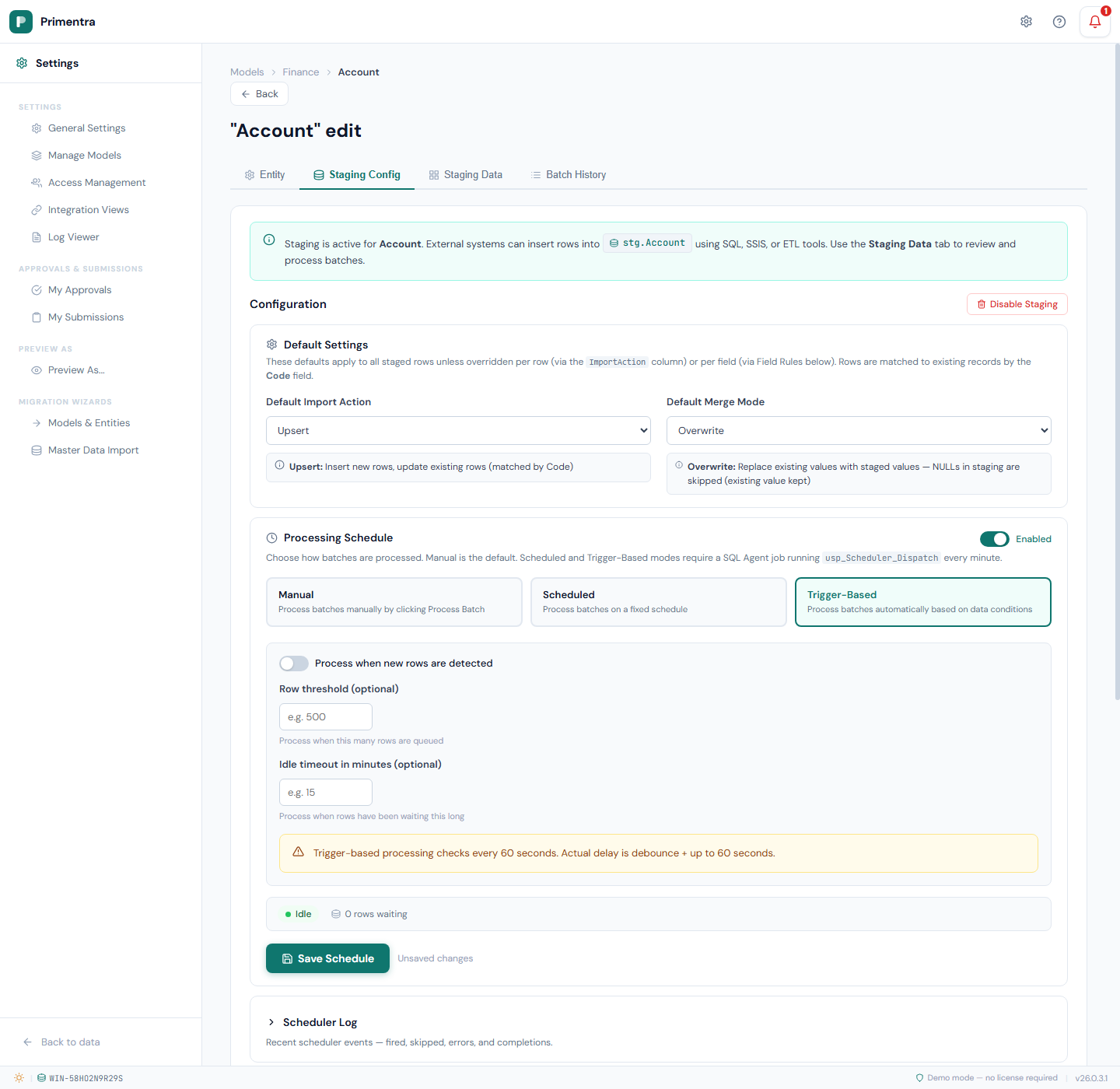 The Staging Scheduler automates batch processing so external systems can push data into staging tables without manual intervention. Each entity is configured independently with its own processing mode, schedule, and triggers.